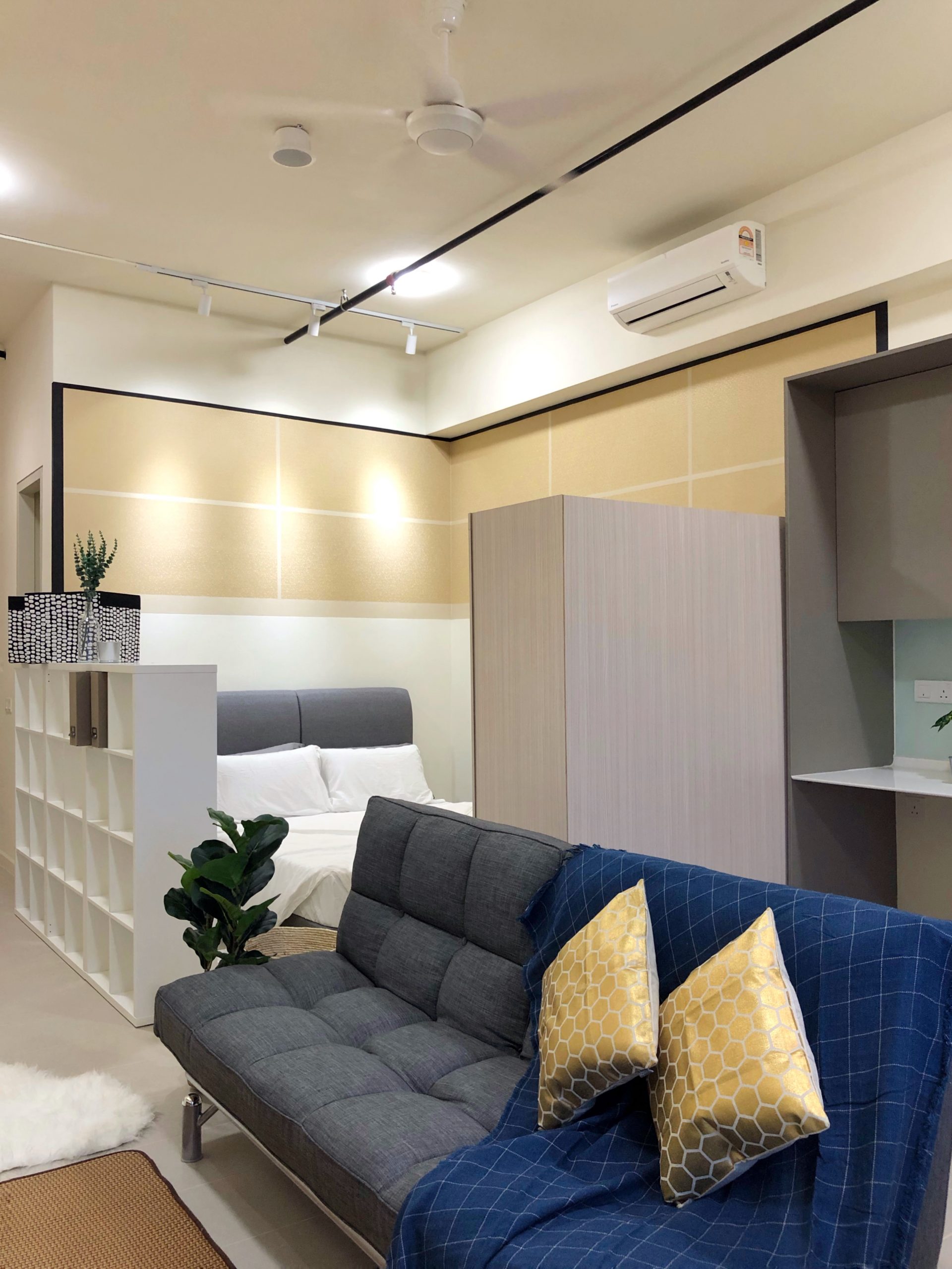 The request is to furnish the space while dividing the area between the bedroom, dining, kitchen and living in her 450sqft studio. The unit comes with a kitchen given by the developers. Quite a bit of a challenge as the layout is not quite big and the arrangement needs to be done carefully but it was manageable. The unit was completed within a month.